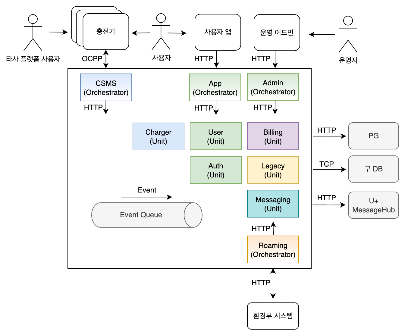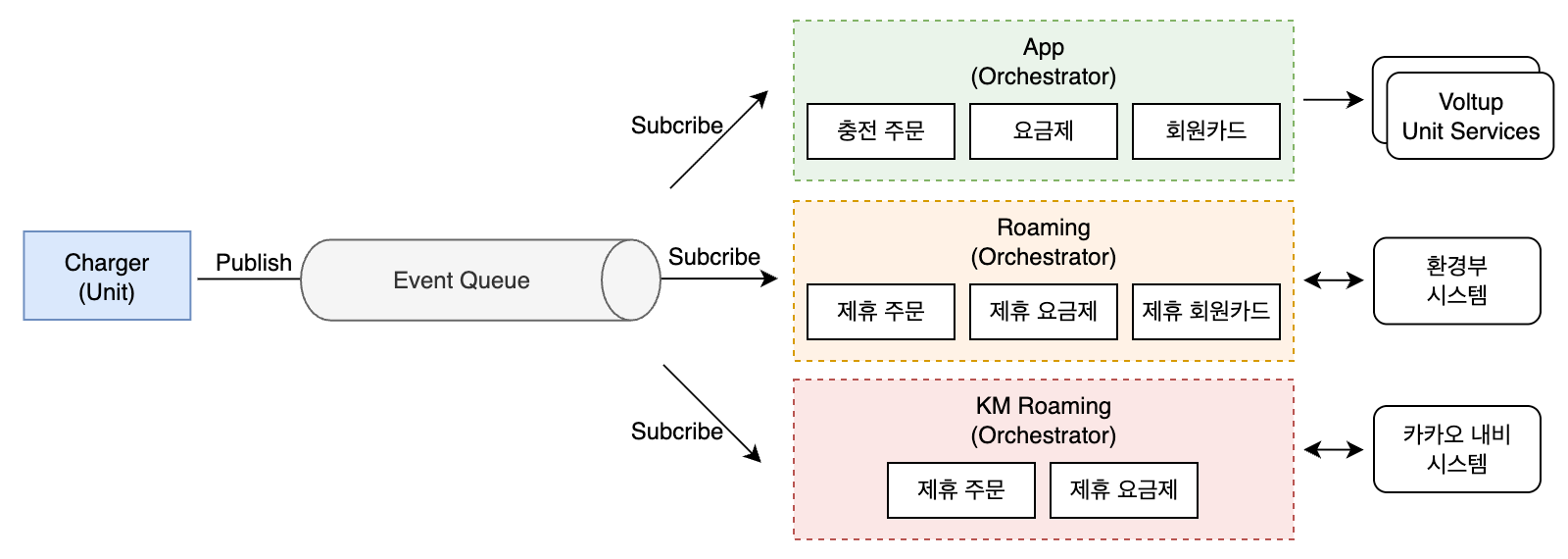 사용자 유형별로 달라지는 인증 로직과 요금 정보는 별도의 오케스트레이터를 만들어 구현했습니다. 각 오케스트레이터는 충전 관련 이벤트를 구독하면서, 자체 요금제를 반영해 주문 정보를 갱신하고 제휴사 시스템과 연동됩니다. Charger 서비스에서 사용자 유형별로 로직을 분기하지 않고, 외부 오케스트레이터에 사용자마다 달라지는 기능을 구현함으로써, 결과적으로 시스템은 향후 또 다른 사용자 유형이나 결제 수단을 쉽게 추가할 수 있는 유연성을 얻었습니다.