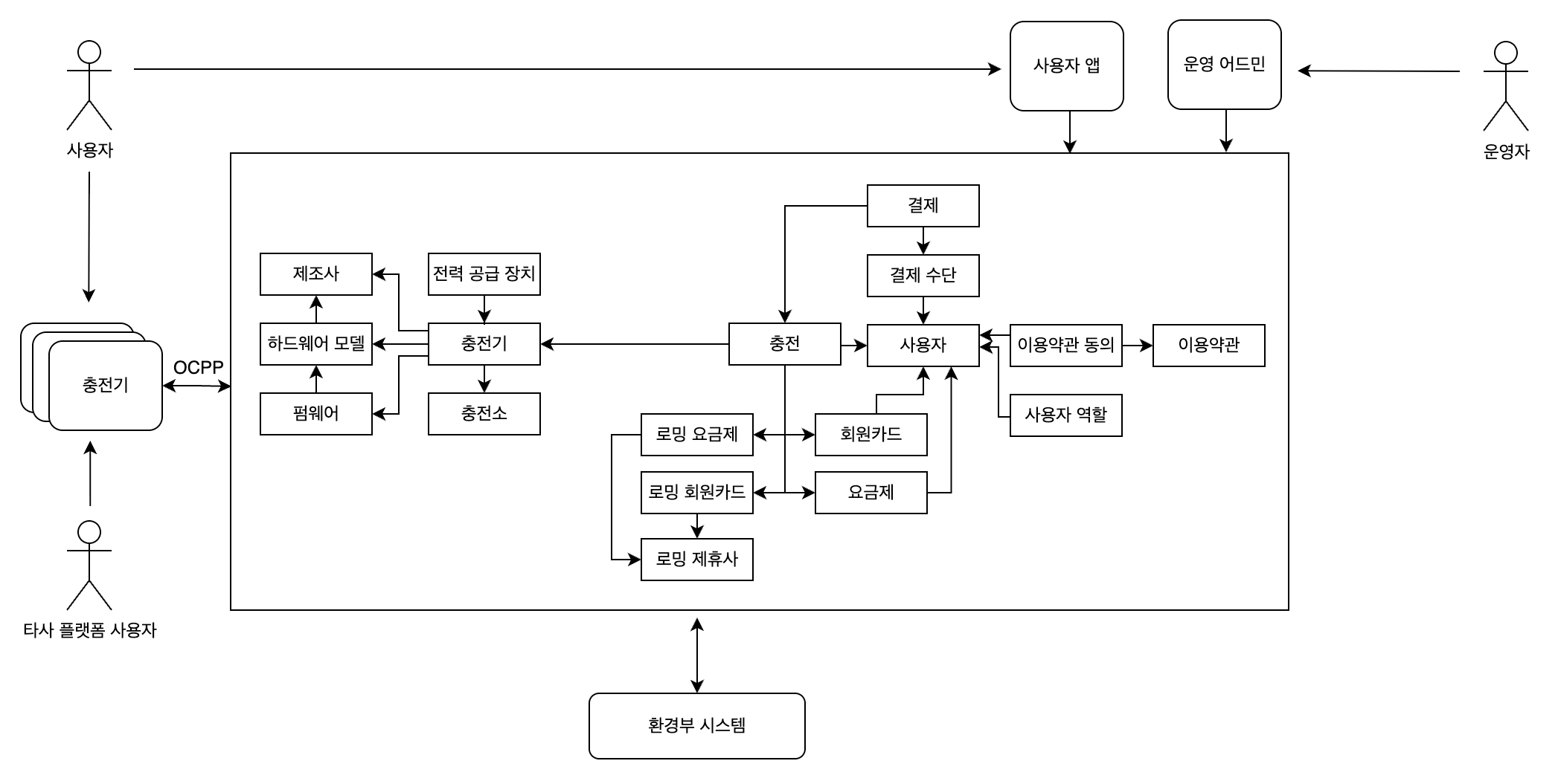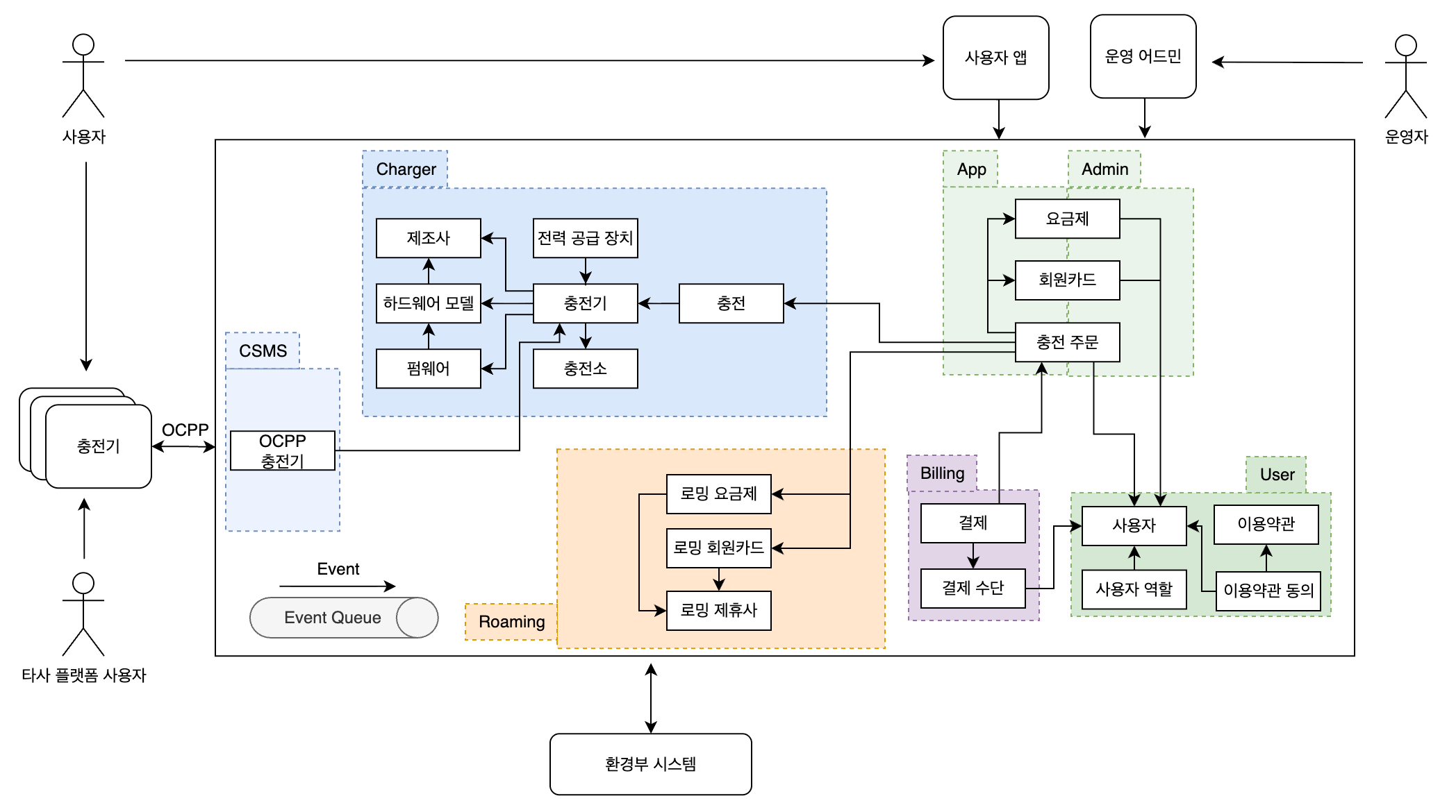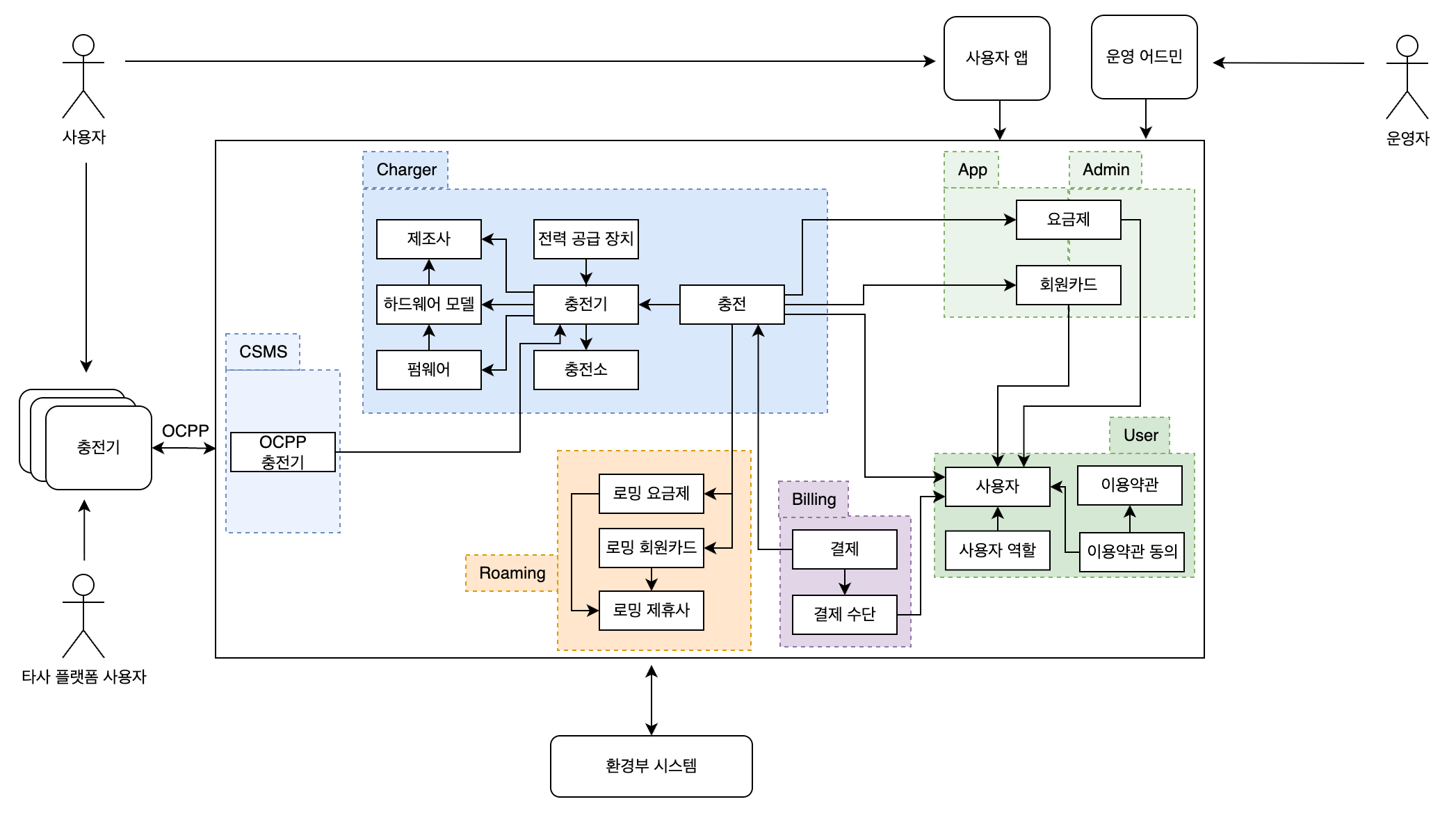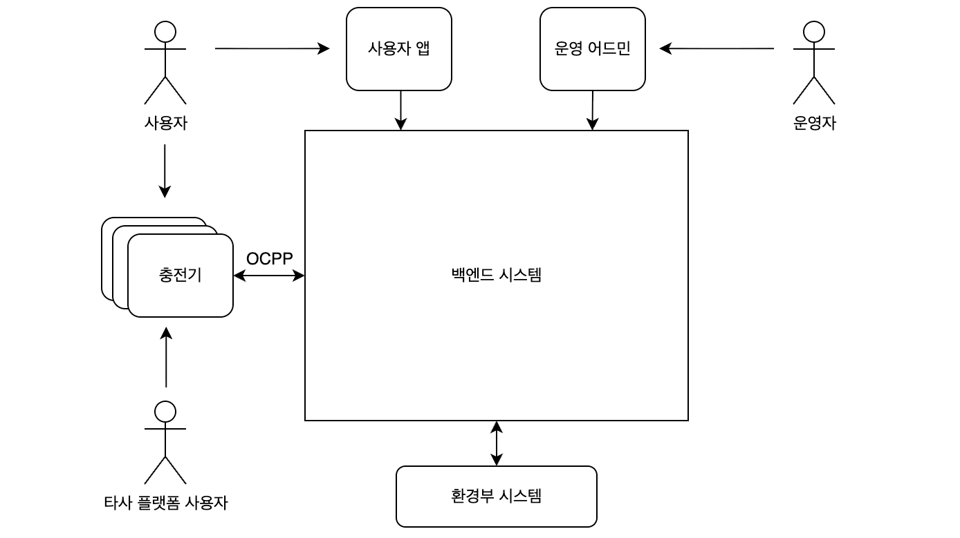 백엔드 시스템과 연동되는 클라이언트 소프트웨어로 충전기 펌웨어, 사용자 앱, 운영 어드민, 그리고 환경부 시스템이 있습니다. 각 클라이언트는 시스템 내에서 다음과 같은 역할과 기능을 가집니다.