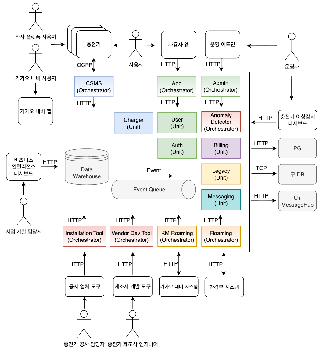 그리고 저희 시스템은 사용자 앱에서 발생하는 트래픽보다 충전기에서 발생하는 트래픽이 훨씬 클 것으로 예상되었습니다. 그래서 충전기의 트래픽을 처리하는 CSMS 컴포넌트만 선택적으로 인프라 자원을 확장할 수 있는 MSA가 더 높은 점수를 얻었습니다.