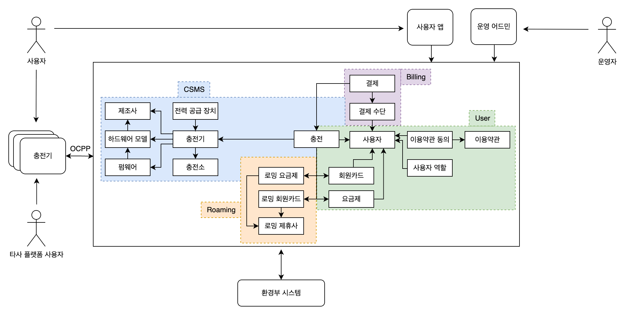 MSA를 채택한 이후, CSMS 컴포넌트는 CSMS, User 컴포넌트는 User 서비스, Billing 컴포넌트는 Billing 서비스라는 이름으로 개발이 진행되었습니다. 이 당시 CSMS는 충전기와 연관된 데이터를 관리하는 기능과 충전기 요청을 받아 다른 서비스들의 기능을 조합해 유즈케이스를 처리하는 로직이 함께 존재했습니다. 마찬가지로 User 서비스도 사용자와 연관된 데이터를 관리하는 기능과 사용자 앱, 그리고 운영 어드민에서 요청되는 유즈케이스를 처리하는 로직이 함께 있었습니다.